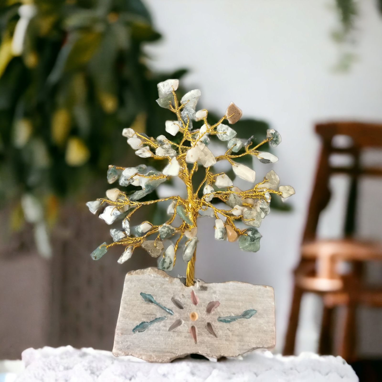 Arborele Fericirii este alcătuit dintr-o coroană generoasă, împodobită cu cele 80 de pietre prețioase, și un suport solid din piatră, care îi conferă stabilitate și eleganță. Dimensiunile sale compacte îl fac potrivit pentru a fi amplasat în orice colț al casei sau biroului tău.