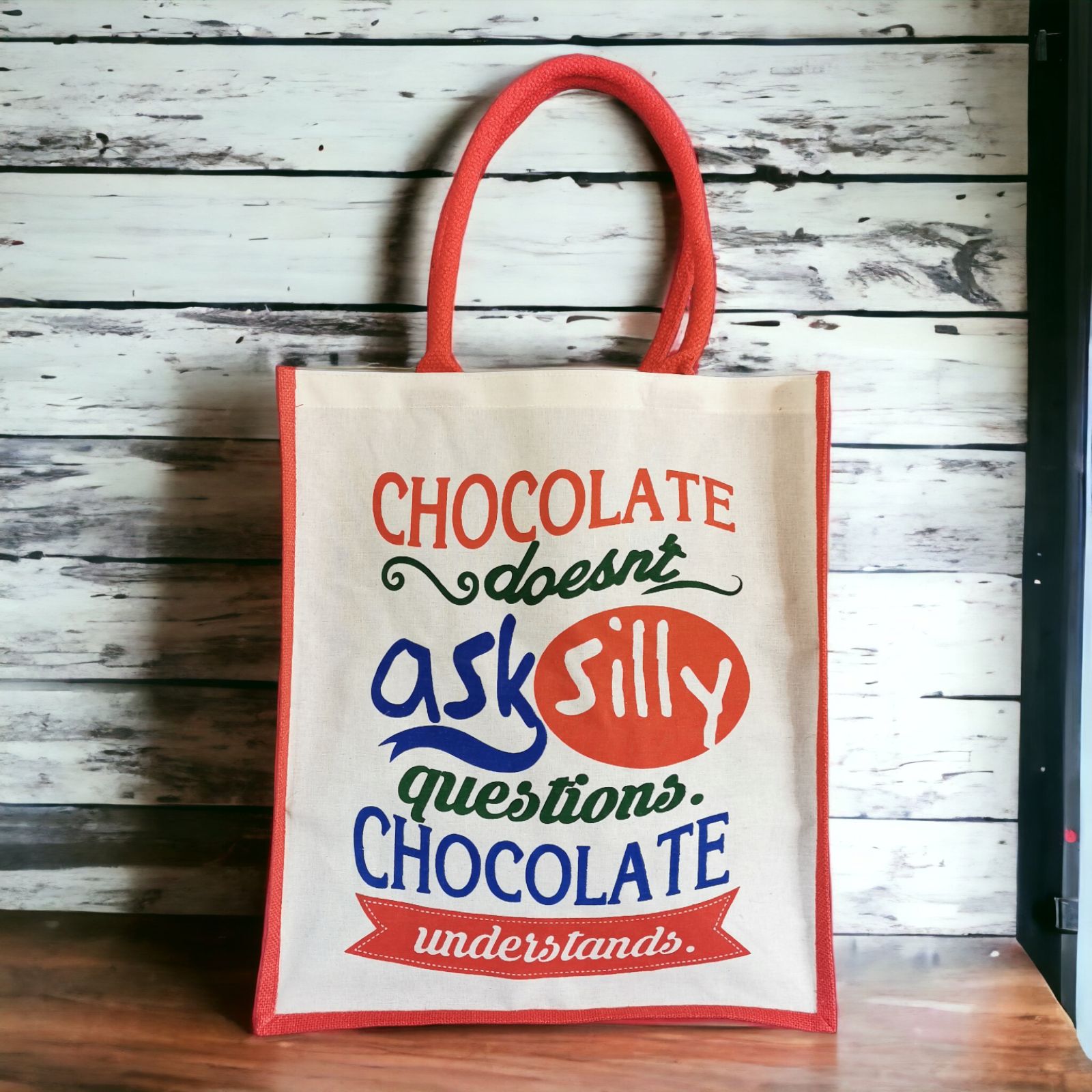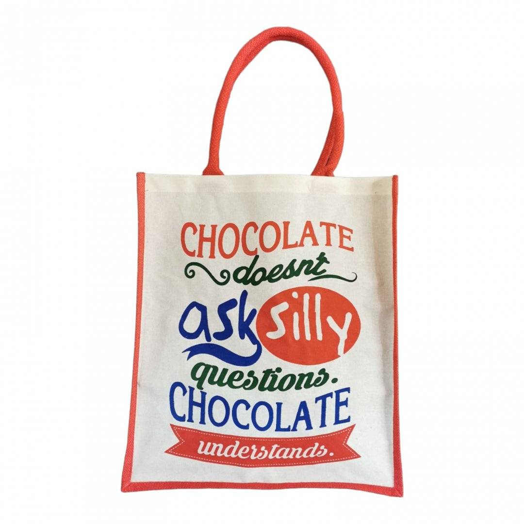 Geanta de iută - Win cu mesajul inspirațional "Chocolate Doesn't Ask" este o adevărată comoară artizanală. Fiecare etapă a procesului de producție este efectuată cu atenție și dedicare, garantând un produs de înaltă calitate.