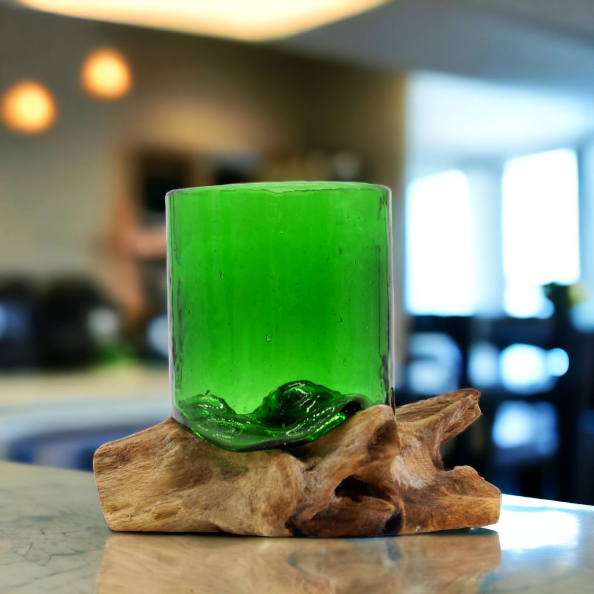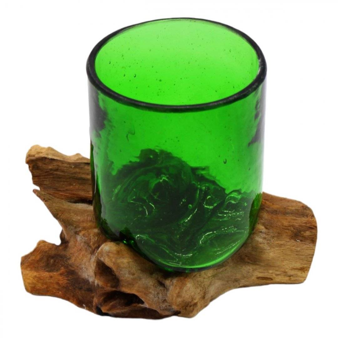 Descoperiți eleganța și originalitatea în fiecare pahar cu suport din lemn masiv, o creație unică și ecologică realizată manual în Bali, Indonezia. Aceste pahare reprezintă un amestec captivant între frumusețea sticlei reciclate și căldura naturală a lemnului.
